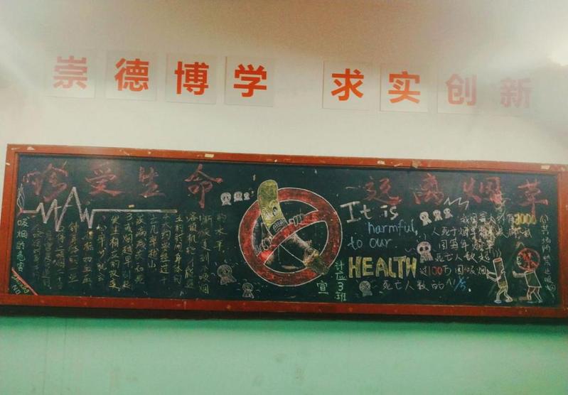 為加強(qiáng)宣傳力度,營造禁煙氣氛,組織并要求班級(jí)進(jìn)行禁煙專題系列的黑板報(bào)設(shè)計(jì)。