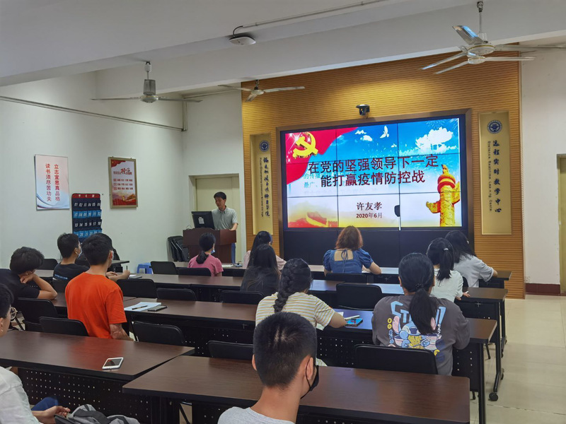 為了深入學習貫徹習近平新時代中國特色社會主義思想特別是習近平總書記最新重要講話精神,深入貫徹落實黨的十九大和十九屆二中、三中、四中全會精神,強化制度自信教育,用好中國抗疫這本深刻、鮮活、生動的思政課教科書,教育引導學生充分認識中國共產黨領導和中國特色社會主義制度的顯著優(yōu)勢,增強“四個意識”、堅定“四個自信”、做到“兩個維護”,傳承和弘揚愛國主義精神,培養(yǎng)德智體美勞全面發(fā)展的社會主義建設者和接班人。2020年6月23日在2號樓2-1教室,信息工程系黨總支書記許友孝書記、信息工程系主任黃金鳳分別為2018級部份學生及預備黨員、入黨積極分子做了題為“在黨中央堅強領導下堅決打贏疫情防控阻擊戰(zhàn)”和“疫情猶在,防控銘記”的形勢與政策報告。