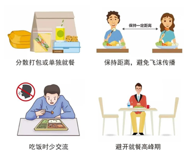 5.前往食堂就餐時應錯峰就餐,避開就餐高峰期,排隊時保持前后一米左右的距離,吃飯前應先洗手,就餐時時少交流,保持距離分散入座,避免飛沫傳播。