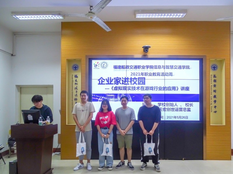 講座由福州天宏創(chuàng)世文化傳播股份有限公司運營總監(jiān)吳捷分別從行業(yè)動態(tài)分析、行業(yè)數(shù)據(jù)分享、行業(yè)技術要求、技術案例分享等方面為我院學子做了以“虛擬現(xiàn)實應用技術在游戲行業(yè)的應用”為主題的分享。