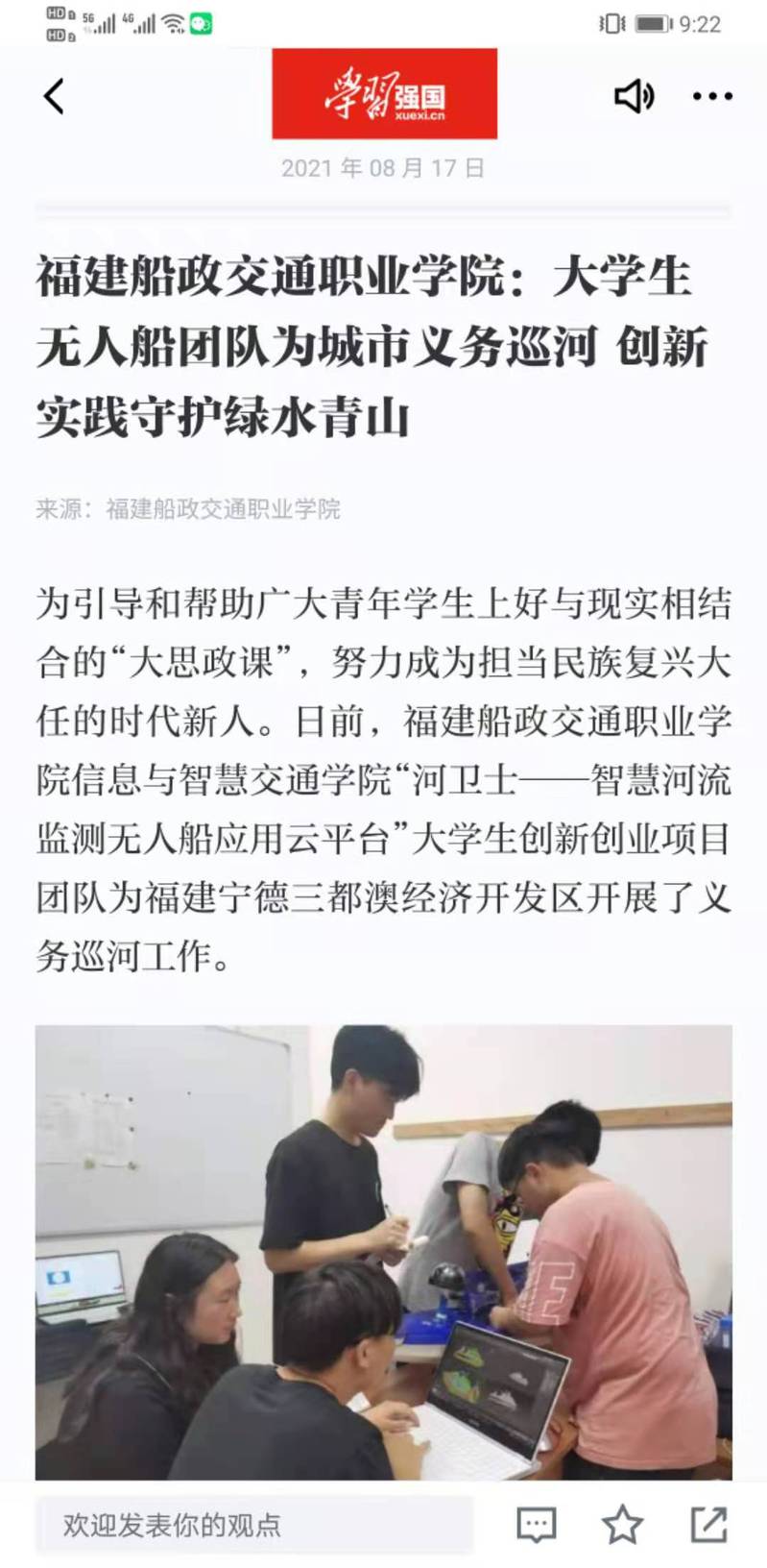 為引導(dǎo)和幫助廣大青年學(xué)生上好與現(xiàn)實(shí)相結(jié)合的“大思政課”,努力成為擔(dān)當(dāng)民族復(fù)興大任的時(shí)代新人。日前,福建船政交通職業(yè)學(xué)院信息與智慧交通學(xué)院“河衛(wèi)士——智慧河流監(jiān)測無人船應(yīng)用云平臺(tái)”大學(xué)生創(chuàng)新創(chuàng)業(yè)項(xiàng)目團(tuán)隊(duì)為福建寧德三都澳經(jīng)濟(jì)開發(fā)區(qū)開展了義務(wù)巡河工作。