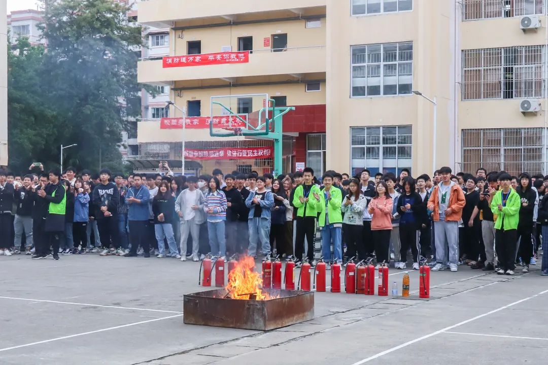 活動現場,鄭佳偉和張德華老師認真指導師生們如何正確使用滅火器,并親自為信息學子演示滅火器的使用并邀請學生們上場實際操作。