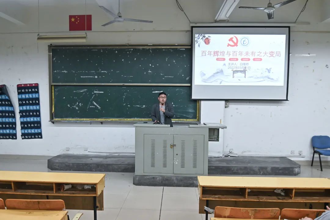 信息與智慧交通學(xué)院第一黨支部書記白鋒橋老師以《百年輝煌與百年未有之大變局》為主題,主要從中國共產(chǎn)黨的百年輝煌業(yè)績、深刻把握百年未有之大變局、百年輝煌業(yè)績?yōu)閼?yīng)對百年大變局提供重要條件三個部分展開,為同學(xué)們上了一堂黨課。