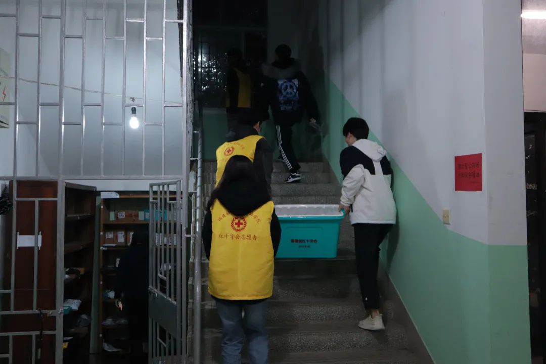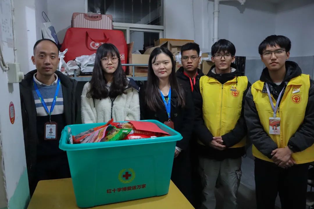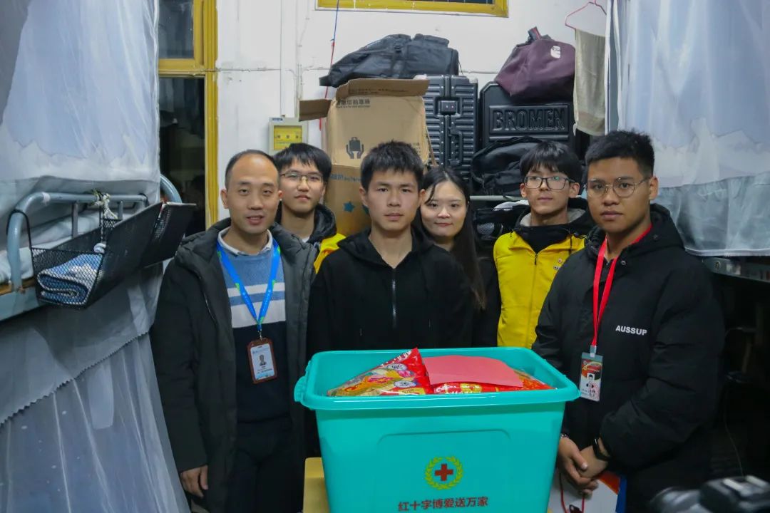 1月11日,分團(tuán)委書記沈曉家,鄭佳偉輔導(dǎo)員,紅十字會(huì)代表與紅十字會(huì)志愿者們一起前往排下同學(xué)的宿舍,為他們送上了慰問品以至即將到來新春的祝福。