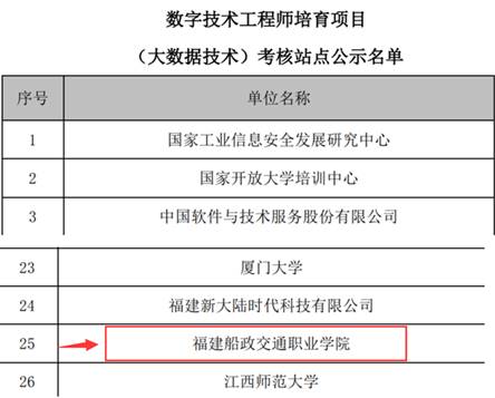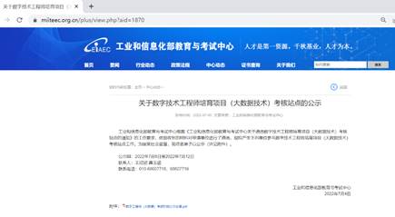2022年7月,工業(yè)和信息化部教育與考試中心在官司網進行了遴選結果的公示,https://www.miiteec.org.cn/plus/view.php?aid=1870。我校成為首批數字技術工程師培育項目(大數據技術)考核站點之一。