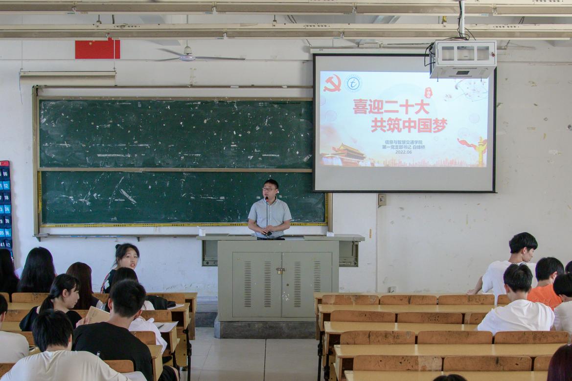 信息與智慧交通學(xué)院第一黨支部書記白鋒橋以《喜迎二十大 共筑中國夢》為主題,圍繞“開展背景及時間相關(guān)概念綜述”、“政治工作的總體要求”、“政治工作的學(xué)習(xí)教育內(nèi)容”、“政治工作的主要措施”、“政治工作的組織領(lǐng)導(dǎo)”五個方面展開。