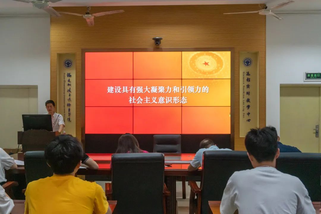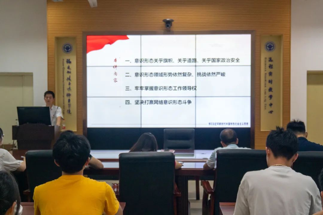 黨總支書記許友孝結(jié)合黨的二十大報告和習(xí)近平總書記關(guān)于意識形態(tài)工作的重要講話精神,圍繞“意識形態(tài)關(guān)乎旗幟、關(guān)乎道路、關(guān)乎國家政治安全”、“意識形態(tài)領(lǐng)域形勢依然復(fù)雜、挑戰(zhàn)依然嚴峻”“牢牢掌握意識形態(tài)工作領(lǐng)導(dǎo)權(quán)”、“堅決打贏網(wǎng)絡(luò)意識形態(tài)斗爭”四個方面展開講解。
