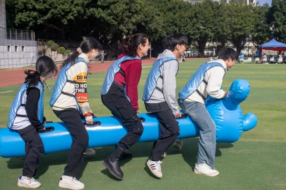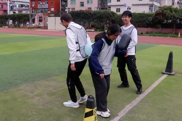 分為五大組,每一輪各組出2人,背夾氣球,步調(diào)一致向前走,繞過(guò)轉(zhuǎn)折點(diǎn)回到起點(diǎn),下一小組兩人開(kāi)始前進(jìn)。向前走時(shí),雙手不能碰到球,否則一次罰2秒;球掉后從起點(diǎn)重新開(kāi)始游戲。先完成者勝出。
