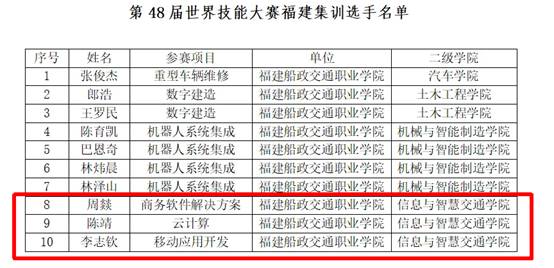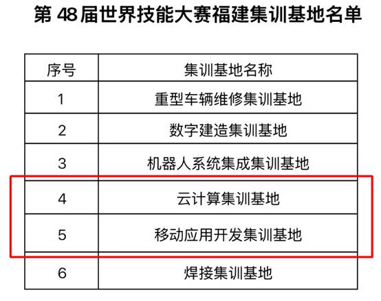 近日,福建省人力資源和社會保障廳正式公布第48屆世界技能大賽福建省集訓(xùn)基地名單,我院云計算、移動應(yīng)用開發(fā)兩大項(xiàng)目基地成功入選。同時,我院三名優(yōu)秀選手憑借過硬技能實(shí)力,成功入圍本屆福建省集訓(xùn)隊(duì)。