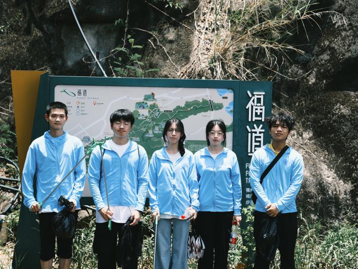 (實(shí)踐團(tuán)成員清理周邊垃圾以及與福道合影)