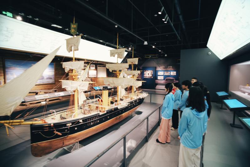 實(shí)踐團(tuán)在船政博物館看到,漢代樓船、宋代海船模型靜靜泊在展柜里,仿佛在等待出港的號(hào)角。馬尾海戰(zhàn)全息投影啟動(dòng)時(shí),炮聲、火光、海浪一起涌來,大家下意識(shí)抓緊欄桿,像真的站在甲板上。船政學(xué)堂復(fù)原教室里,木課桌、銅墨水瓶、老式地球儀一字排開,黑板上的“師夷長技以自強(qiáng)”粉筆字清晰可見。有人坐到課桌前,把筆記本攤在面前,閉眼想象百年前瑯瑯書聲,再睜眼時(shí),鼻尖竟有些發(fā)酸。