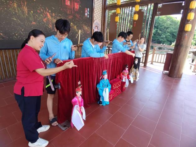 暮色之中,傳承團(tuán)前往木偶戲戲臺學(xué)習(xí)提線木偶。在觀看了一場精彩的《拜壽》戲曲后,成員們躍躍欲試,開始對提線木偶技藝進(jìn)行初步嘗試。細(xì)繩纏繞指尖,輕拉慢放間,木偶仿佛被注入了生命,輕輕顫動。成員們?nèi)褙炞?,一絲不茍地模仿師傅的動作,盡管手法尚顯生疏,卻難掩對這門古老藝術(shù)的敬畏與熱愛。在這靜謐與靈動交織的瞬間,傳統(tǒng)技藝的種子悄然播撒心田,激發(fā)起成員們傳承與創(chuàng)新的責(zé)任感。
