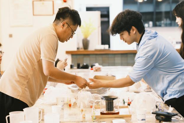 短暫互動后,踐行團成員協(xié)助臺灣大學生完成非遺漆扇制作?;顒又?,掌握漆藝技巧的踐行團成員從扇面構圖到漆料運用,手把手指導臺灣同伴完成調(diào)色、繪制等工序。雙方在創(chuàng)作過程中交流兩岸漆藝發(fā)展情況,互鑒創(chuàng)作靈感,原本素白的扇面逐漸呈現(xiàn)出獨具特色的紋樣。這些由兩岸青年共同完成的漆扇作品,既承載著傳統(tǒng)工藝的匠心,又融入了青春友情的溫度。此次活動通過非遺手作這一生動形式,讓兩岸青年在協(xié)作中深化文化認同,為基層社會服務增添了動人的文化色彩。