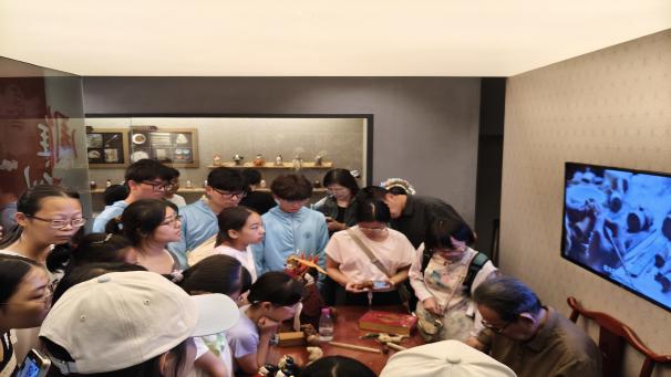 成員們圍攏在木偶工作臺旁,老匠人的刻刀起落間,木屑紛飛,他們從中感知木偶頭“三分面七分神”的奧秘。展柜里,閩南民居模型的榫卯結(jié)構吸引著傳承團成員,他們反復端詳。聆聽非遺故事,觸摸技藝溫度,傳承團心中滿是對閩藝的震撼與傳承熱忱。