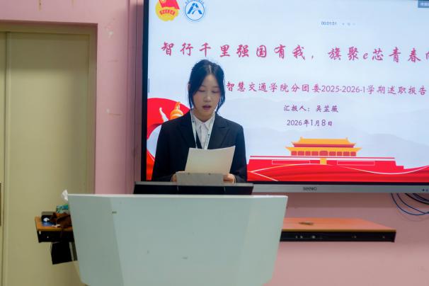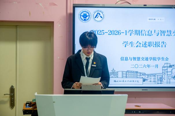為總結(jié)2025-2026學(xué)年第一學(xué)期工作成效,強(qiáng)化團(tuán)學(xué)組織責(zé)任擔(dān)當(dāng),推動(dòng)學(xué)生工作在立德樹(shù)人征程中穩(wěn)健發(fā)展。2026年1月8日,信息與智慧交通學(xué)院2025-2026-1學(xué)期兩委學(xué)生干部述職大會(huì)在福道園自強(qiáng)樓2-3教室舉行。學(xué)院分團(tuán)委負(fù)責(zé)人沈晨晞老師、學(xué)院分團(tuán)委宣傳委員周文廣老師,學(xué)院團(tuán)組織學(xué)生干部、學(xué)院學(xué)生會(huì)工作人員及學(xué)生代表參加會(huì)議。會(huì)議由學(xué)院分團(tuán)委兼職副書(shū)記(學(xué)生)陳澤帥主持。