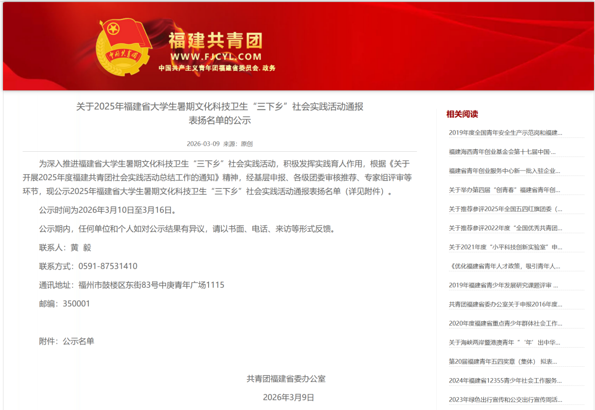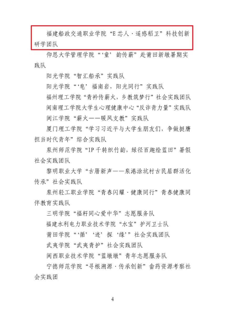 近日,共青團(tuán)福建省委辦公室公示2025年大學(xué)生暑期“三下鄉(xiāng)”社會(huì)實(shí)踐活動(dòng)表揚(yáng)名單,由我院林少丹教授率領(lǐng)的“E芯人·遙感稻衛(wèi)”科技創(chuàng)新研學(xué)團(tuán)榮獲省級優(yōu)秀實(shí)踐團(tuán)隊(duì)。