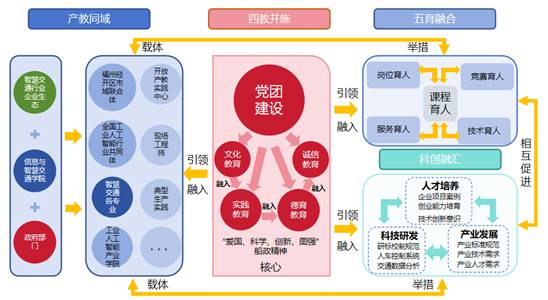 智慧交通專業(yè)群實施產(chǎn)教同域,共建產(chǎn)業(yè)學(xué)院,優(yōu)化教育配置,增強學(xué)生實踐與就業(yè)。四教并施強化黨建與職業(yè)技能基礎(chǔ),五育融合提升專業(yè)技能與責(zé)任感。