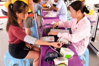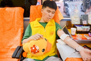 同學(xué)們被小黃鴨獻(xiàn)血車萌萌的外表吸引,紛紛填表登記,上車捋袖獻(xiàn)血。