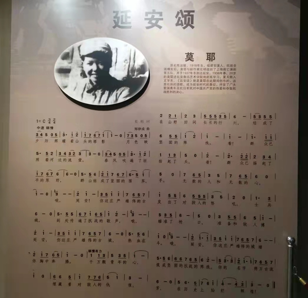 “夕陽輝耀著山頭的塔影,月色映照著河邊的流螢。春風(fēng)吹遍了坦平的原野,群山結(jié)成了堅(jiān)固的圍屏。哦,延安!你這莊嚴(yán)雄偉的古城,到處傳遍了抗戰(zhàn)的歌聲……”團(tuán)員青年們來到《延安頌》展廳前,一起聆聽由福建安溪籍老革命女作家莫耶創(chuàng)作的獻(xiàn)給革命圣地的心靈之歌《延安頌》,大家都沉醉在壯麗的歌聲中,感受到當(dāng)時(shí)廣大愛國青年及抗日軍民對中國共產(chǎn)黨的熱愛和奪取抗日勝利的決心。
