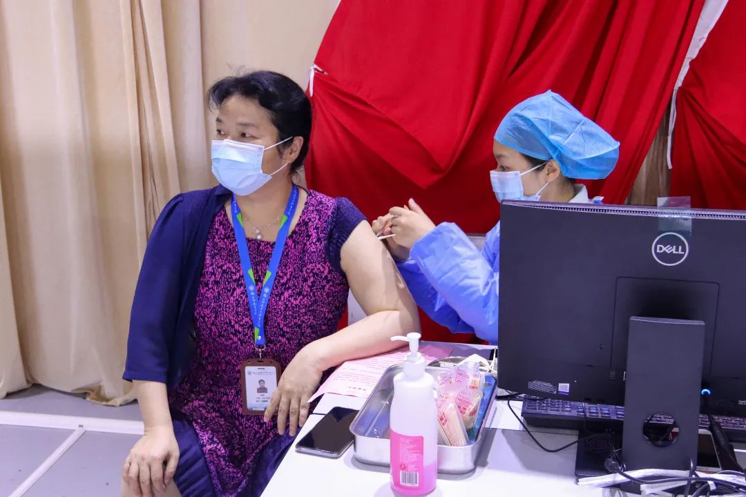 接種現(xiàn)場(chǎng),現(xiàn)場(chǎng)等待區(qū)、登記區(qū)、注射區(qū)和留觀區(qū)區(qū)隔分明、井然有序。當(dāng)日下午,學(xué)院336名教職員工順利有序完成疫苗接種工作。