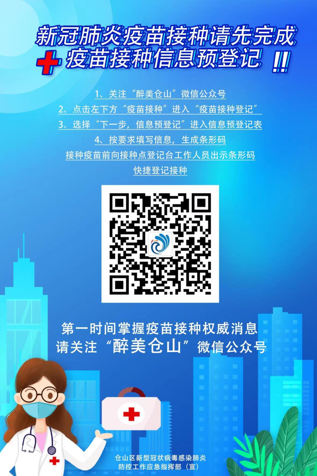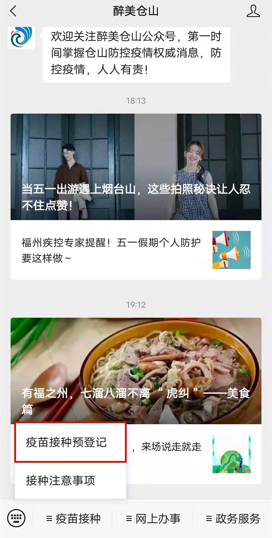 關(guān)注并進(jìn)入“醉美倉(cāng)山”公眾號(hào)后,點(diǎn)擊下方“疫苗接種”按鈕,再點(diǎn)擊“疫苗接種預(yù)登記”。