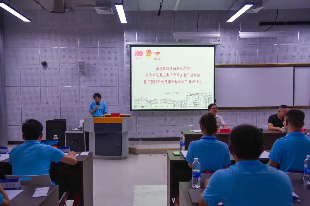 2021年7月8日下午,福建船政交通職業(yè)學(xué)院青馬學(xué)院第三期“青馬工程”培訓(xùn)班暨“2021年教師團(tuán)干培訓(xùn)班”開班儀式在武夷新區(qū)職教園舉行。學(xué)院黨委副書記陳宜大、武夷職教園副主任林峰民及青馬學(xué)院第三期“教師團(tuán)干培訓(xùn)班”全體學(xué)員參加了會(huì)議,會(huì)議由學(xué)院團(tuán)委副書記梁晶主持。