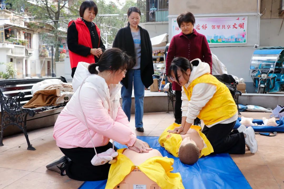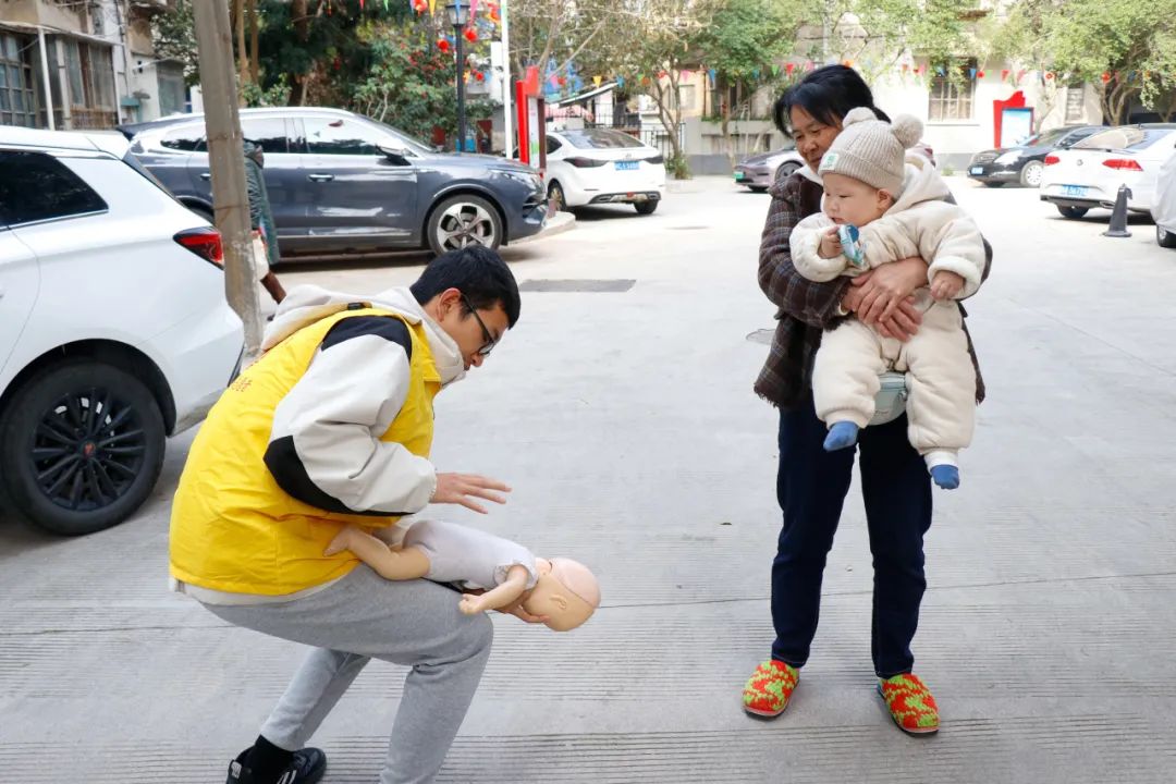 志愿者先向居民講解有關(guān)心肺復(fù)蘇救護(hù)、海姆立克急救法和包扎的基本常識(shí)與應(yīng)用環(huán)境,隨后居民在志愿者們的協(xié)助下進(jìn)行實(shí)操,如在仿真人體上演練心肺復(fù)蘇和海姆立克急救法,真人練習(xí)三角巾包扎,讓居民們對(duì)于急救知識(shí)有了深入的了解。