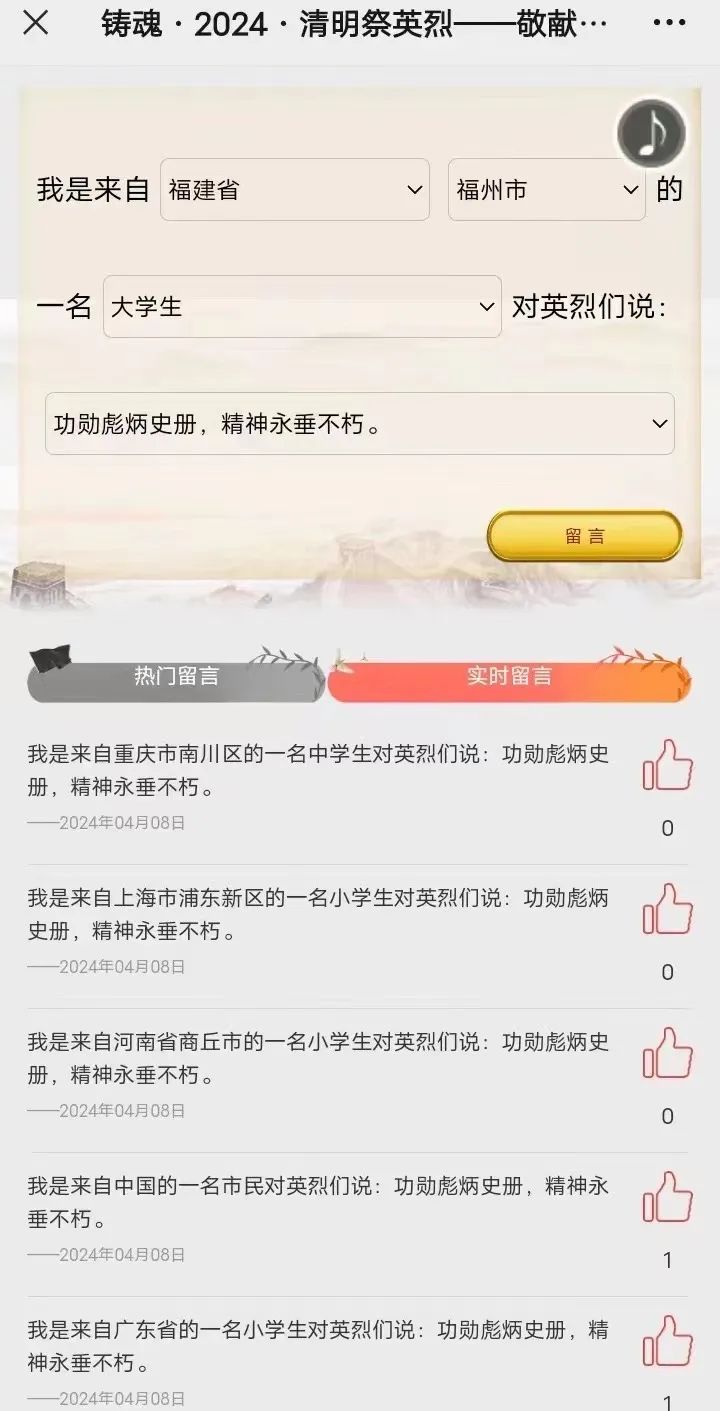 為進(jìn)一步增進(jìn)我院廣大學(xué)生繼承和弘揚(yáng)革命英烈的精神,培養(yǎng)大學(xué)生愛國(guó)意識(shí),經(jīng)濟(jì)與管理學(xué)院于2024年4月4日開展“祭奠革命英烈,傳承紅色精神”網(wǎng)絡(luò)寄語(yǔ)活動(dòng)。