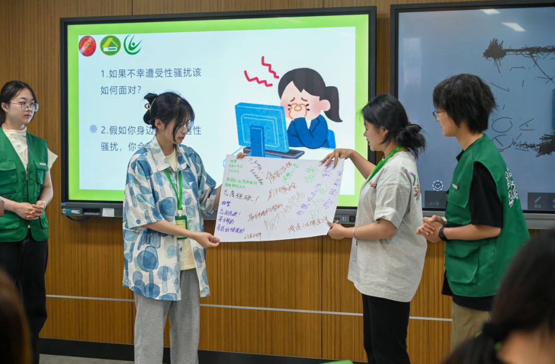 最后,由福建幼兒師范高等??茖W(xué)校的青春健康主持人開展以“預(yù)防性騷擾知識(shí)科普”為主題的活動(dòng)分享,通過角色扮演的方式營造相對(duì)輕松安全的氛圍,緩解參與者面對(duì)性騷擾話題的羞恥、尷尬心理,也清晰界定了性騷擾的形式,隨后通過小組討論的形式告訴參與者遇到性騷擾應(yīng)保持冷靜,明確表達(dá)拒絕,留存證據(jù),尋求他人幫助。