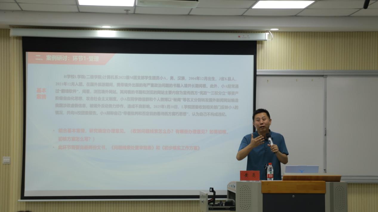 最后一講,是中央團校黃亮老師帶來的《團紀執(zhí)行案例教學(xué)》。課程通過聚焦團紀執(zhí)行核心,明確縣級及以上團的委員會組織部門等執(zhí)紀權(quán)限,詳解從受理到處分執(zhí)行的5個關(guān)鍵步驟,全程強調(diào)集體研究的重要性;并通過現(xiàn)場模擬案例,切實提升教師團干依規(guī)執(zhí)紀能力,為團務(wù)工作開展和青年學(xué)生行為規(guī)范提供清晰遵循。