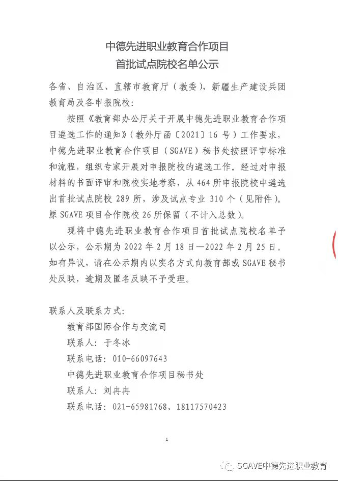 中德先進(jìn)職業(yè)教育合作項(xiàng)目(簡(jiǎn)稱SGAVE項(xiàng)目)是教育部與德國等歐洲職業(yè)教育模式先進(jìn)國家行業(yè)龍頭企業(yè)聯(lián)合實(shí)施的職業(yè)教育合作項(xiàng)目。該項(xiàng)目深化產(chǎn)教融合、校企合作,深入推進(jìn)育人方式、辦學(xué)模式、管理體制、保障機(jī)制改革,借鑒“雙元制”辦學(xué)模式,推動(dòng)建設(shè)具有國際先進(jìn)水平的中國特色職業(yè)教育體系。