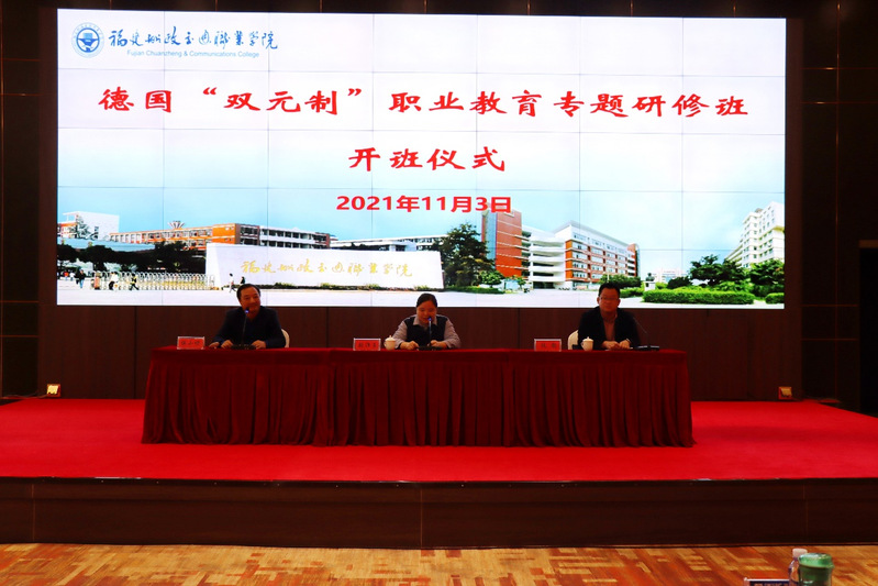 中德職業(yè)教育聯(lián)盟福建省示范基地德國(guó)“雙元制”職業(yè)教育專題研修班在我院武夷新區(qū)職教園順利開(kāi)班,福建省教育國(guó)際交流協(xié)會(huì)副秘書長(zhǎng)張沛玉出席開(kāi)班儀式,福建船政交通職業(yè)學(xué)院對(duì)外交流中心主持儀式。來(lái)自福建省本科、高職及中職29所學(xué)校共100名骨干教師、專業(yè)帶頭人及教學(xué)管理人員參加此次研修班學(xué)習(xí)。