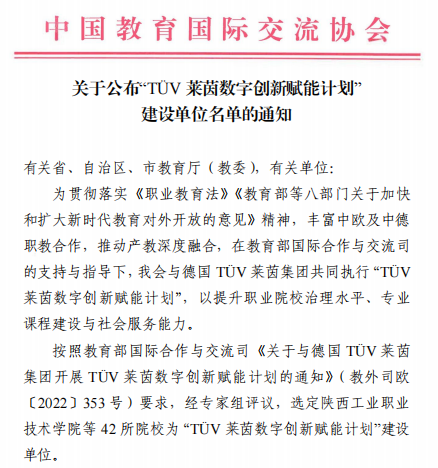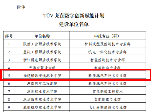 2023年3月14日,中國教育國際交流協(xié)會公布了“TüV萊茵數(shù)字創(chuàng)新賦能計劃”建設(shè)單位名單。我校成為建設(shè)單位之一,新能源技術(shù)專業(yè)群被確立為建設(shè)專業(yè),在獲批名單內(nèi)排名第五。